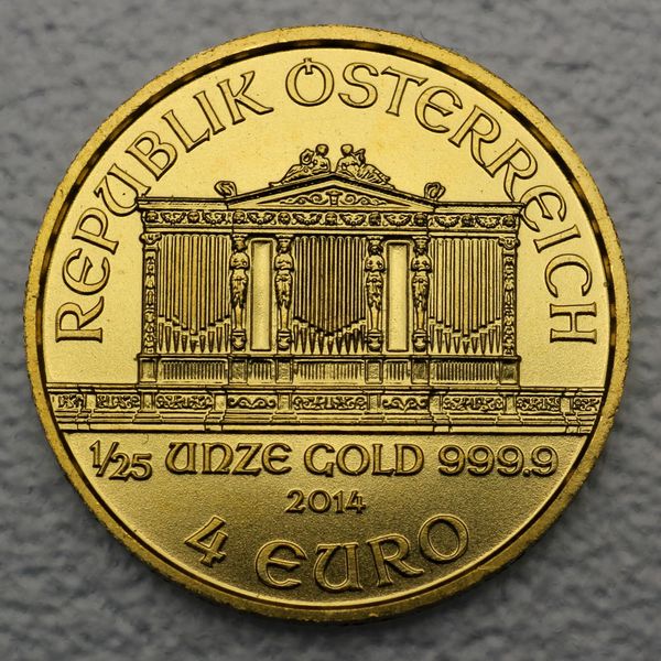 1/25 Unze Philharmoniker Gold 1/25 oz = 1,24 Gramm Gold Ab 20 Stück liefern wir den 1/25 oz