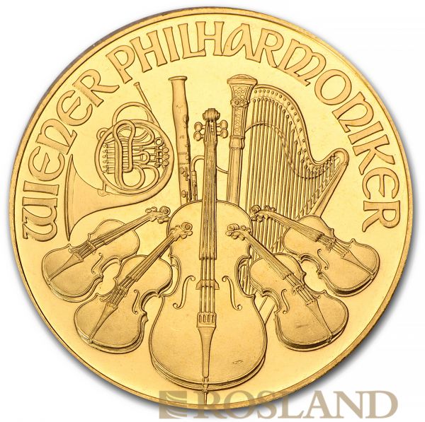 Exklusive 1 Unze Goldmünze mit Euro-Nennwert; Berühmte Wiener Philharmoniker als Motiv; Kostenloser, sicherer und anonymer Versand; Elegantes Investment: Die Wiener Philharmoniker in 1 Unze Gold, eine Anlagemünze mit 999,9 Feingehalt und Euro-Nennwert; Symbolträchtiges Design: Motiv mit acht Instrumenten des berühmten Orchesters, inklusive der Orgel im Goldenen Saal